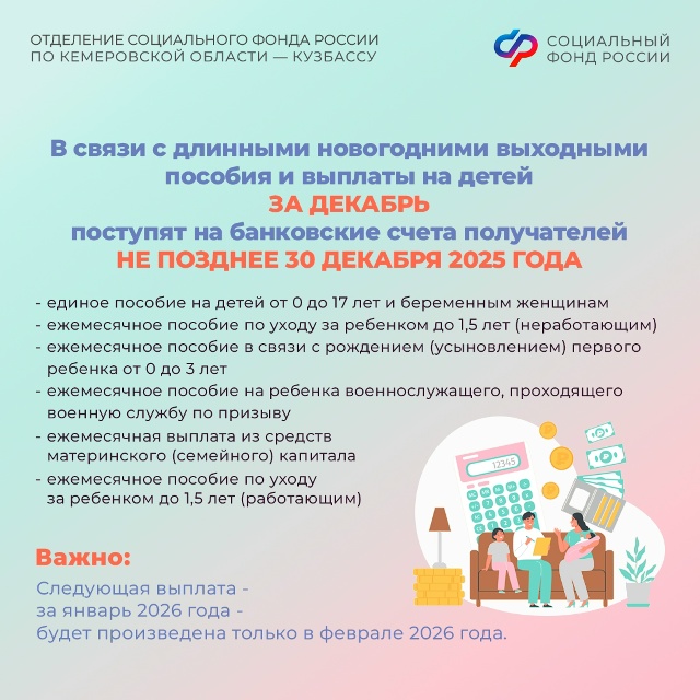 В связи с предстоящими новогодними праздниками Отделение СФР по Кемеровской области произведет выплату пособий семьям с детьми за декабрь досрочно – до 30 декабря 2025 года.